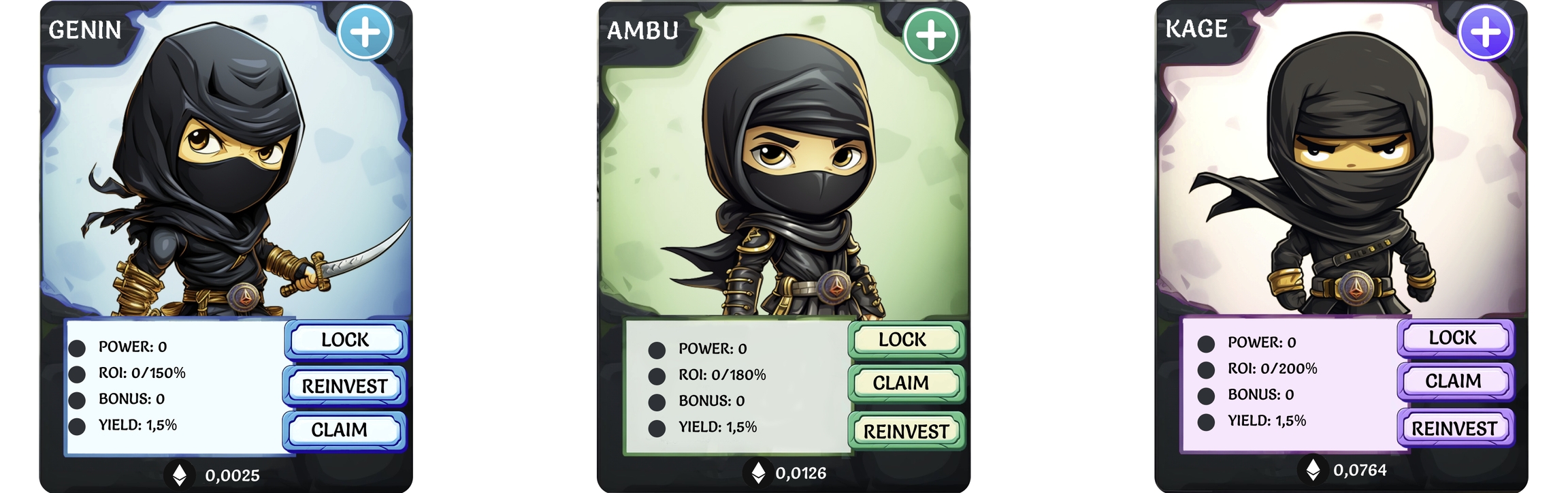 Kage: The most powerful ninja, requiring a minimum investment of 3000 $SHI , with a potential ROI of 200%.